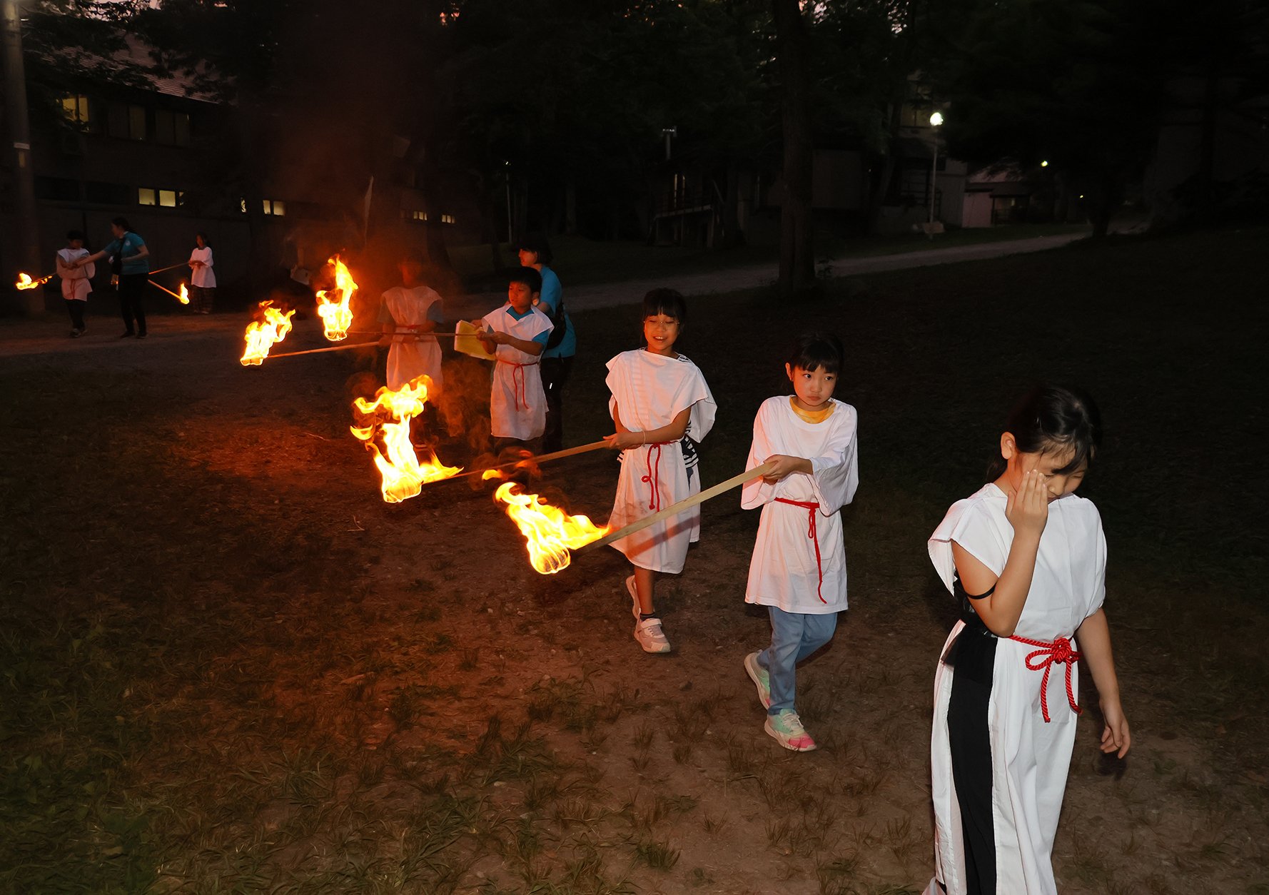 予め選出された火の神と火の神の子(高学年にお願いしました)がトーチで火を運び、点火しました。